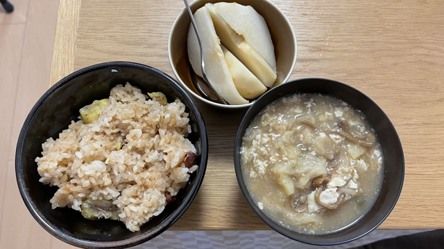 実家から頂いてきた洋ナシと、親戚から頂いてきた栗ご飯を早速頂く。