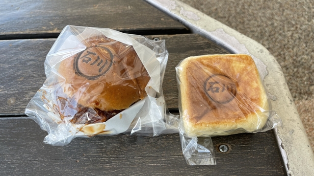 妻へのお土産のメンチカツバーガー(左)と、自分で食べる用のクリームパン(右)。