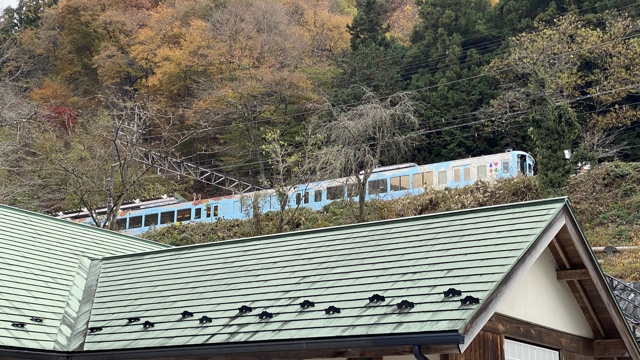 すぐ近くに芦ヶ久保駅があり、電車が来ると車両が見える。