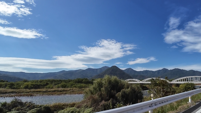 左手方向に流れる千曲川とその向こうに見える山々が美しい。